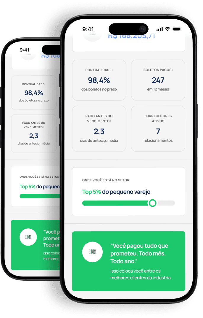 O primeiro perfil verificado de crédito feito para o pequeno varejo brasileiro. Prove sua honestidade e consiga mais prazo, mais limite e mais respeito na praça.